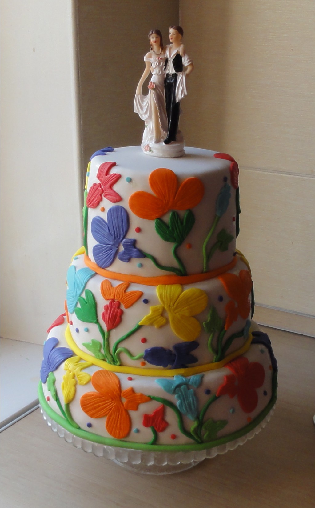 Начинка: Низ - Рыжик с двумя видами крема и персиками, Средний - Сметанник с бананами, персиками и виноградом, Верх - Черный лес